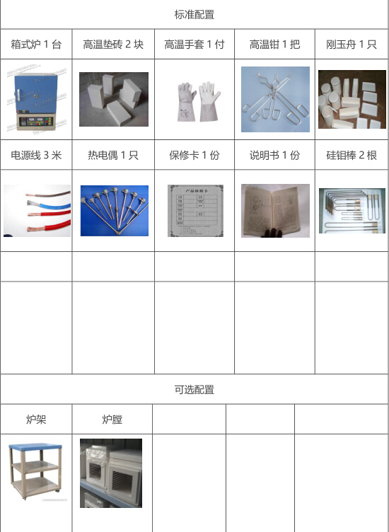 主機1臺,坩堝鉗1把,高溫手套1副,說明書、合格證、保修卡各1份 |