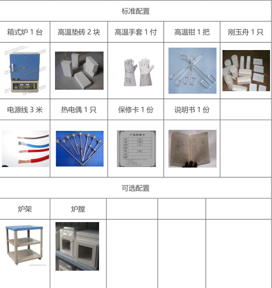 主機1臺,坩堝鉗1把,高溫手套1副,說明書、合格證、保修卡各1份 |
