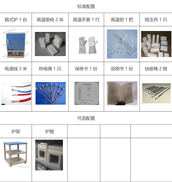 主機(jī)1臺(tái),坩堝鉗1把,高溫手套1副,說(shuō)明書(shū)、合格證、保修卡各1份 |